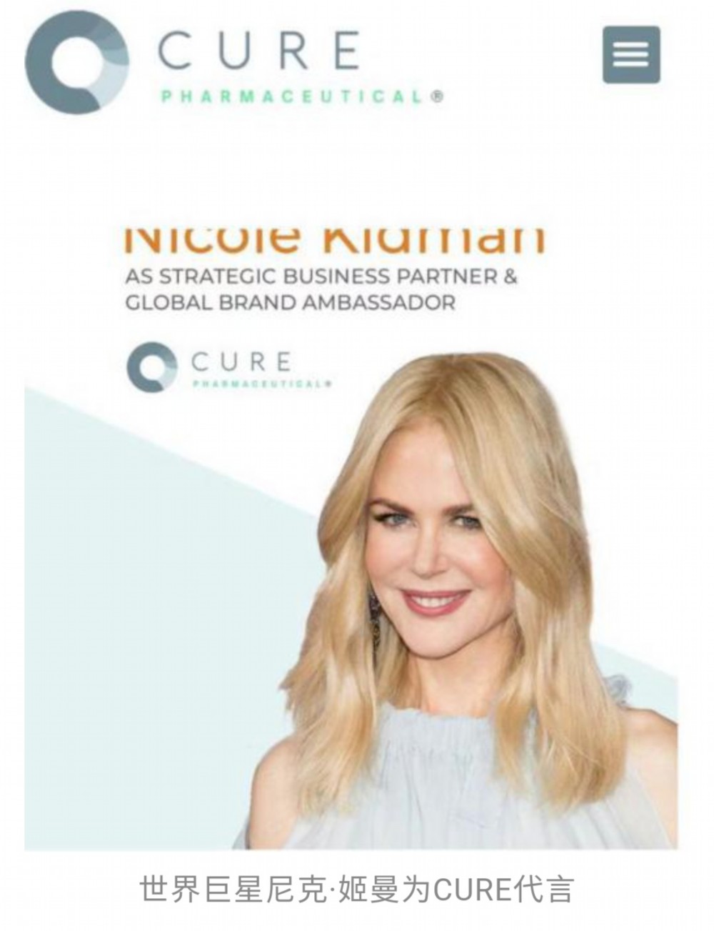 这家公司的皮肤系列产品代言人是世界巨星尼克·姬曼。她主动为他们代言,是因为她的左腿关节受伤后,用CURE的CBD工业大麻止痛消炎的产品,给治好了。