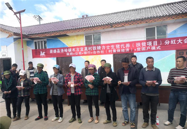 【2019年,铁骑力士集团在凉山州喜德县生猪代养产业扶贫项目出栏生猪1.8万头,实现代养分红500万元,就业岗位200余个,贫困户户均年分红3000元,图为喜德县洛哈镇木古宜莫村分红现场。铁骑力士集团供图】