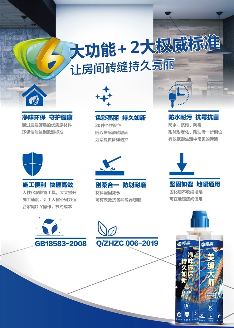 现代人在装修上追求时尚、美观、安全、卫生、环保、耐用……各种瓷砖、天然石材、陶瓷卫浴产品等应用十分普遍。风格设计固然重要,而细节决定成败,美缝产品随之成为新刚需。经典美缝大师具备6大优势于一身,更好地满足广大消费者多样化的需求:
