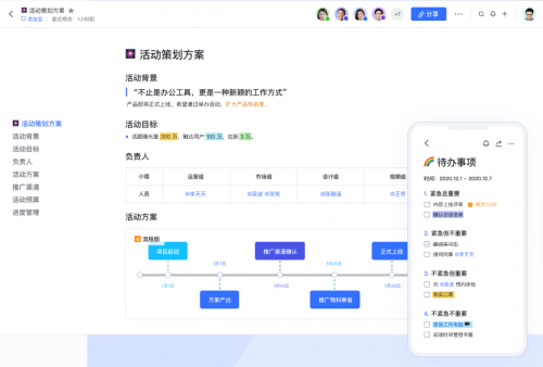 在信息化高速发展的时代,我们办公已经离不开线上的支持,谁能掌握最新的咨询信息,谁就能更快的掌握市场,手机办公软件应运而生。那么目前来讲,比较好用的手机办公软件有哪些呢?我认为,如果你需要一款综合性比较强的软件,那么飞书是比较好的选择。 不同于目前市面上的很多办公软件,都比较倾向于在企业中使用,在日常的生活中的使用频率并不是很大,飞书则是一款集合了很多功能的办公软件。 如果你平时做工作策划或者是做一些日常的思维笔记,那么飞书文档就可以完全满足这些要求。一个好的工作策划并不能仅仅具备优秀的内容,各种小小的设计才是锦上添花,还能从一定程度上展现一些小个性,飞书文档里面有海量的模板,无论是在什么场景下,都可以找到对应的模板来使用。