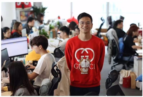 在采访前,我告诉他不用穿的太正式,于是他穿着一件印有“哆啦A梦”图案的红色运动衫出现了。他有很多不同颜色的运动衫,在员工面前发表演讲,他也是穿着同样的衣服。“哆啦A梦”是点猫科技的起点。