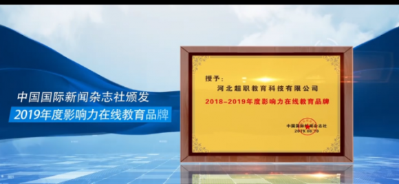 超职教育获中国国际新闻杂志社颁发的“2019年度影响力在线教育品牌”奖项。