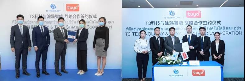 9月16日,东南亚领先电信解决方案提供商T3 Technology Co. Ltd.(以下简称T3科技)与全球化IoT开发平台涂鸦智能(NYSE: TUYA)联合举办发布会并签署战略合作协议,宣布双方将在软件App开发、IoT产品规划设计、生态拓展、云部署等方面通力合作,进一步巩固T3科技在泰国IoT产业的领先优势,全面开辟东南亚市场,领跑数字经济时代。T3科技CEO余小磊,涂鸦智能市场及战略合作副总裁兼CMO那竞丹共同见证战略合作协议签署,并就合作内容进行深入会谈。