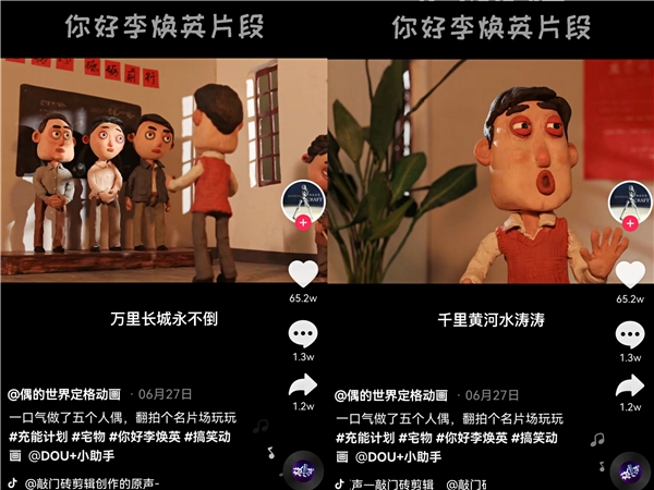 在偶的世界定格动画视频中,有一段 “翻拍”《李焕英》名片段的视频,人偶沈腾的表现比真实电影里的更搞笑,而且人物口型的变化与实际台词几乎无差,代入感极强。不少网友评论,“比原版还经典搞笑”、“哈哈我找到我的快乐源泉了”。这段视频也收获了65万的点赞。