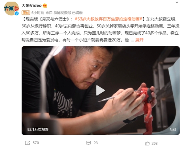 定格动画,指的是通过定格拍摄,然后连续放映组成动画效果,其人物一般由黏土偶,木偶之类的角色担任。有部分网友不了解,看了他的抖音视频后,向霍立明提问,“真厉害,请问是用什么软件做的?”霍立明只能笑着回复:“与软件无关,都是相机一格格拍的”。据了解,一个镜头是由12-24张照片完成,这意味着即使只有十几秒的视频,也是超强度的工作量。