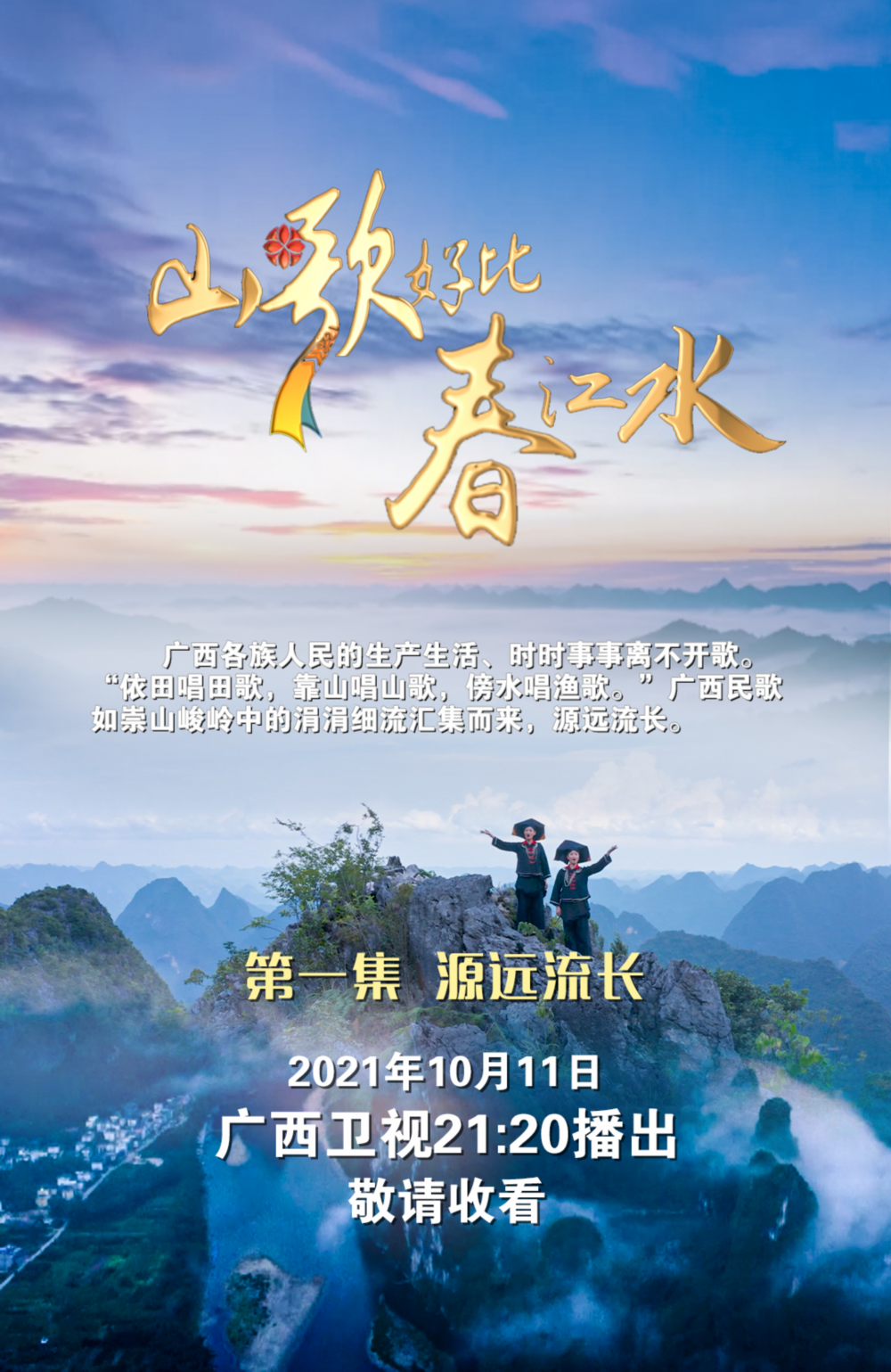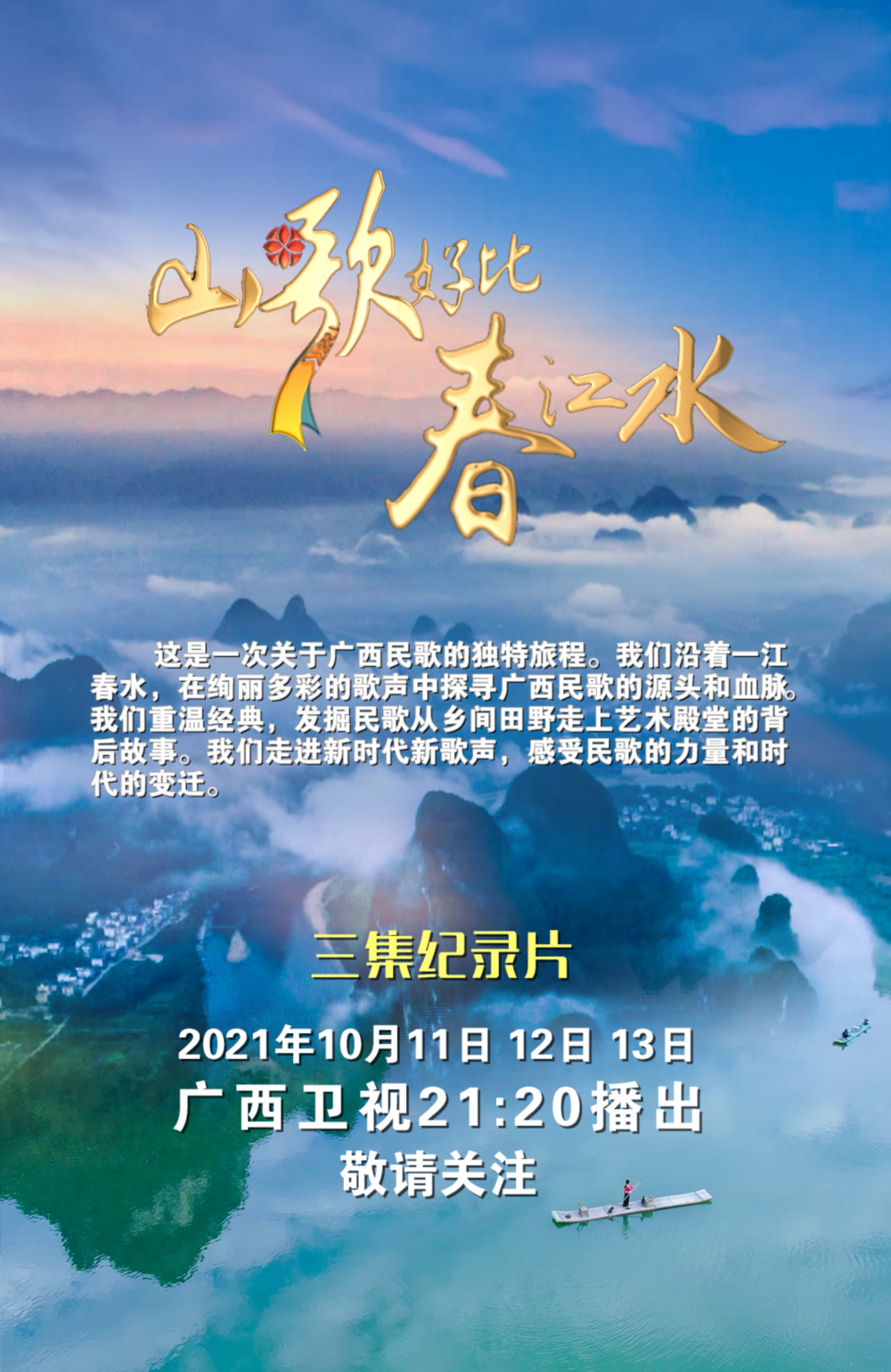 10月11日21:20起,由广西壮族自治区广播电视局、广西广播电视台联合制作的三集音乐纪录片《山歌好比春江水》将连续每日于同一时段在广西卫视播出。