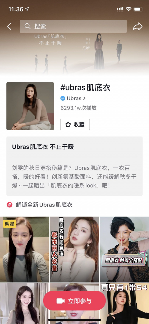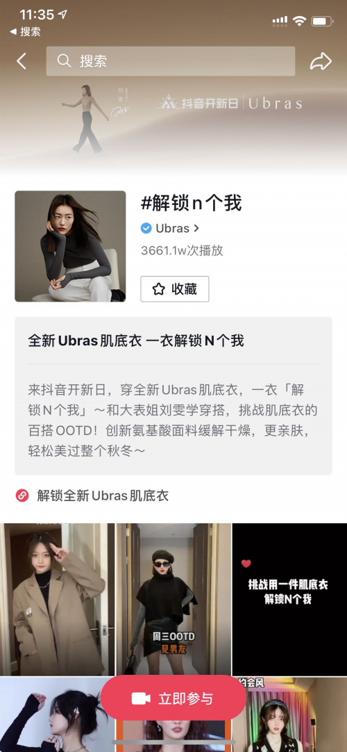 此外,互联网时代的营销绝不是单向输出,而是要与用户达成有效互动。Ubras借助抖音平台开启的品牌专属话题;#ubras肌底衣#、全民挑战赛话题:#解锁n个我#,最大程度上调动了用户参与的积极性,裂变式传播使本次上新能够触达更多用户群体。
