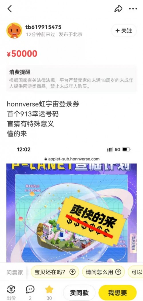 在Honnverse收获火爆预约和热烈讨论的同时,某二手交易平台上也出现了前500号及“幸运号码”的交易与流通。譬如“007”“096”等可在10月28日第一批次进行限量虚拟房屋抢占的“必中号”,最高已挂到2万元,并成功交易,而如在官方规则中表示有幸运礼包发放的“913”号码,在二手平台上已炒到5万元。