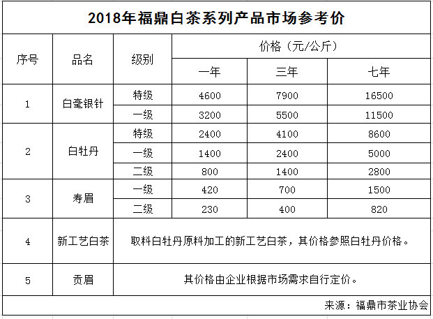从福鼎官方发布的2017年、2018年《福鼎白茶系列产品市场参考价》来看,白牡丹参考价每年以30%左右涨幅增。从图表中不难发现,白牡丹的等级越高,年份越久,价格增长幅度就越高。故而,收藏高等级、高年份的白牡丹投资回报率更高。