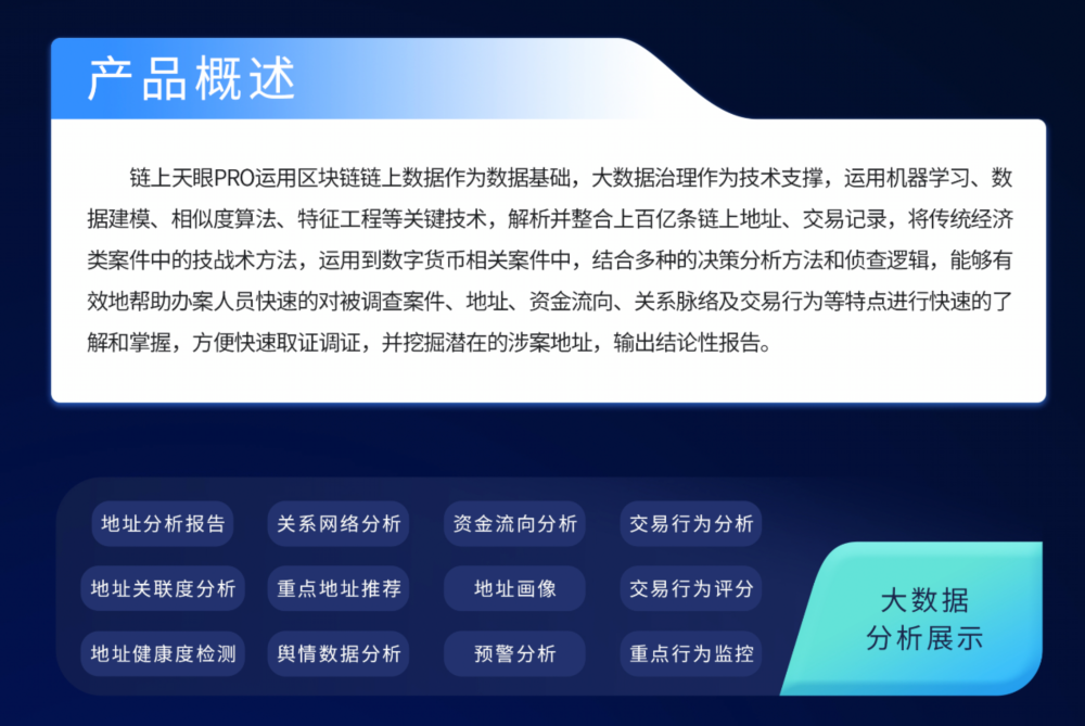 · 功能创新——打造链上数据监控、分析、穿透和治理的一体化服务,实现了“数据可视化”、“24小时实时监控”、“智能化分析研判”、“一键式调证服务”、“资料库”等功能,极大降低了民警应对数字货币案件时的侦办难度,帮助民警快速上手解决相关案件。