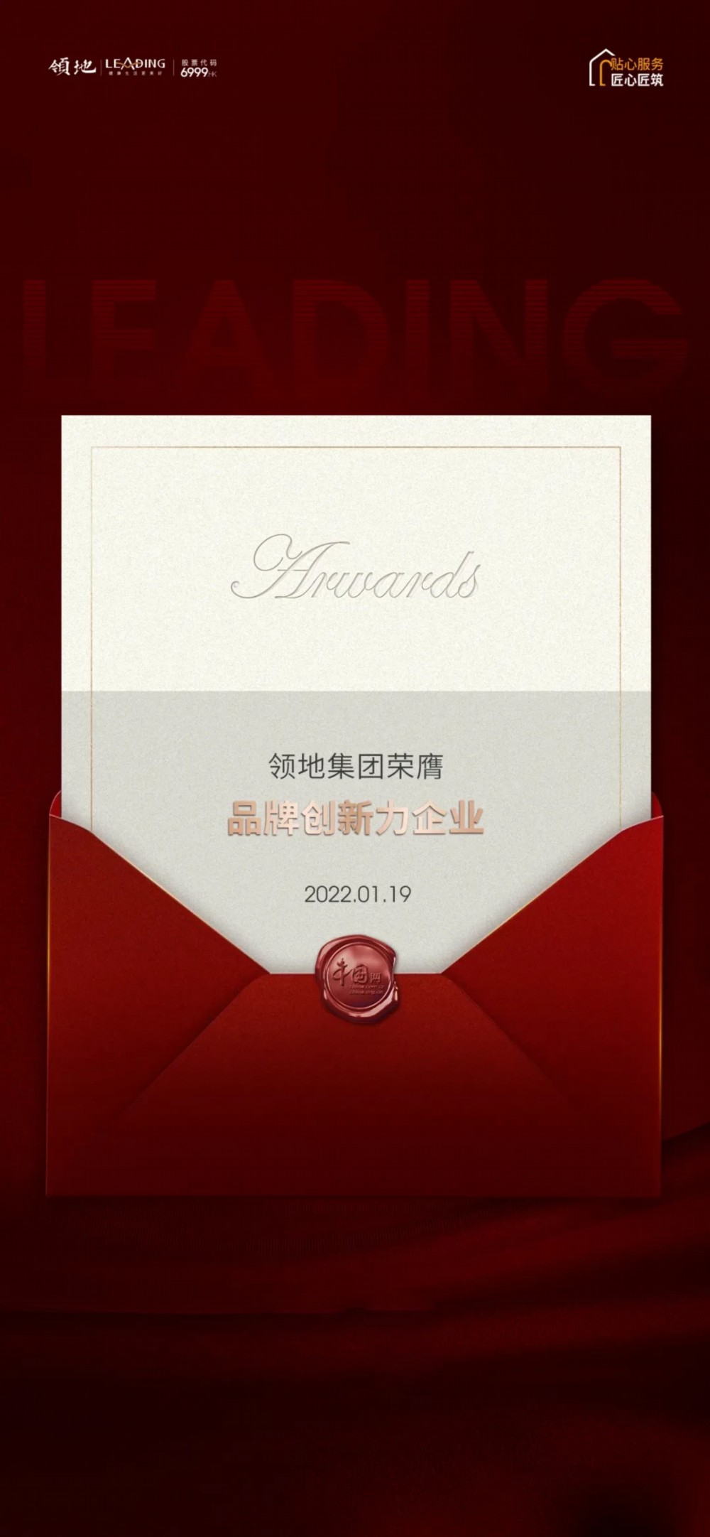 2022年1月19日,在由中国互联网新闻中心主办、中国网地产承办的第十三届地产中国论坛暨2021中国房地产红榜盛典中,领地集团凭借不断提升的品牌创新力,荣膺“2021年度创新力企业”称号。