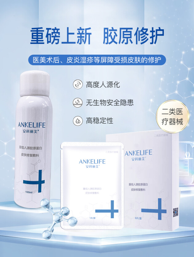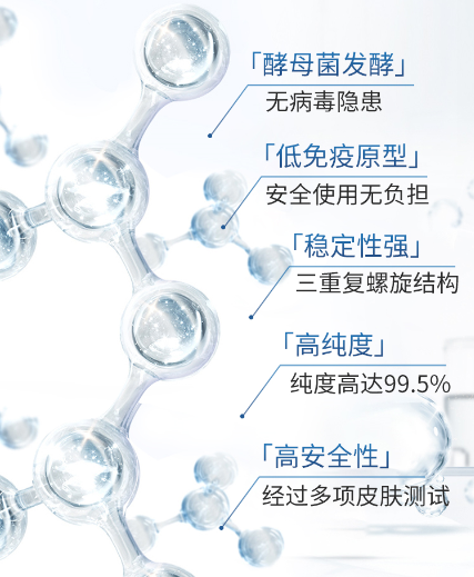 安科丽芙胶原蛋白系列产品成分精简,采用重组人源胶原蛋白作为真核酵母菌发酵,经过高密度发酵、分离、纯化工艺生产的一种具有人胶原蛋白特征的蛋白质高分子生物蛋白。其结构是三重复螺旋结构胶原,RHC纯度高达99.5%,具备高能效的组织修复、屏障修复等效果、与其他类型胶原蛋白相比,优势明显!并获得了北京大学天然药物及仿生药物重点实验室技术支持。产品上市之前通过多项试验检测,皮肤光毒性试验、皮肤刺激试验等多种专业仪器试验,保证产品的安全性。