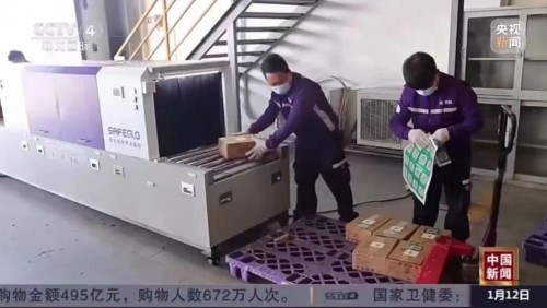 跨越速运员工为专业消杀过的货物贴绿码(央视报道)