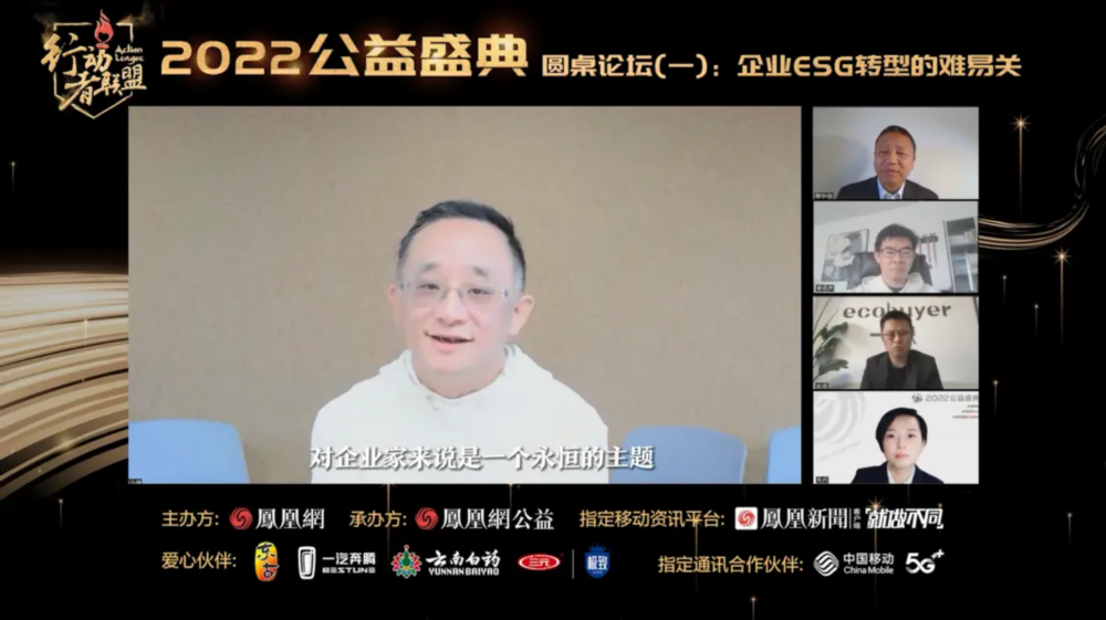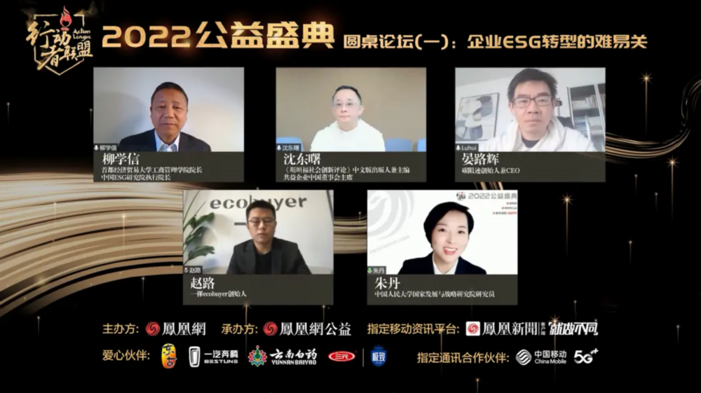 在由中国人民大学国家发展与战略研究院研究员朱丹主持的《企业ESG转型的难易关》圆桌论坛上,首都经济贸易大学工商管理学院院长、中国ESG研究院执行院长柳学信,《斯坦福社会创新评论》中文版出版人兼主编、共益企业中国董事会主席沈东曙,碳阻迹创始人兼CEO晏路辉,一棵ECOBUYER创始人赵路等四位嘉宾共同探讨这些话题,分享了各自的经验和见解。