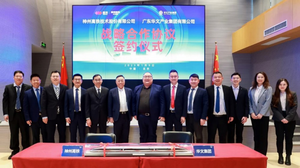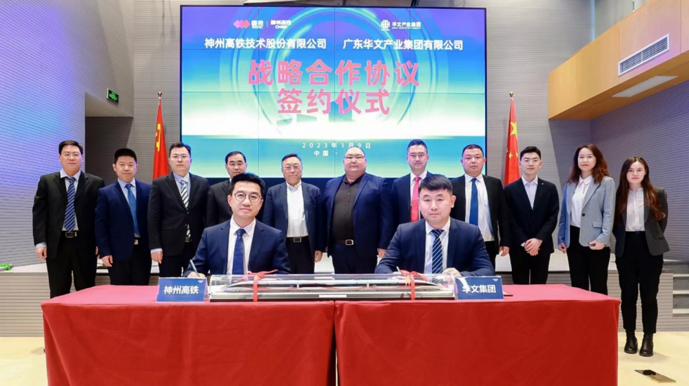 2023年1月9日,神州高铁技术股份有限公司与华文产业集团在京签订战略合作协议,双方将共同整合资源发挥各自优势,实现双方协同发展。在神州高铁董事长、总经理王志全,华文产业集团创始人史泽华见证下,神州高铁副总经理陈冰清、华文产业集团首席执行官李建龙代表双方在战略合作协议上签字。