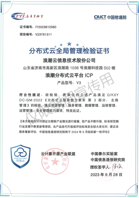 中国信通院作为国内最早从事分布式云标准体系建设及标准测评的专业机构,依托中国通信标准化协会CCSA TC608、云边协同产业方阵等组织,牵头编制分布式云全局管理能力评估行业标准,对分布式云系统在基础设施资源、服务、数据、系统运维、运营、安全性等方面的全局管理能力进行测评。浪潮分布式云平台ICP凭借行业领先的分布式云跨地域云节点间的统一全局资源管理、统一运营运维服务、统一数据管理、统一安全服务能力,在本次测评过程中,经过行业专家的严格测试评估,完全符合分布式云全局管理能力标准测评六大领域共计70余项测评项要求,以优异表现通过首批专项测评认证。