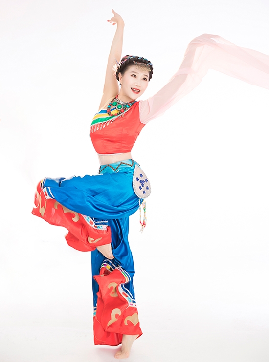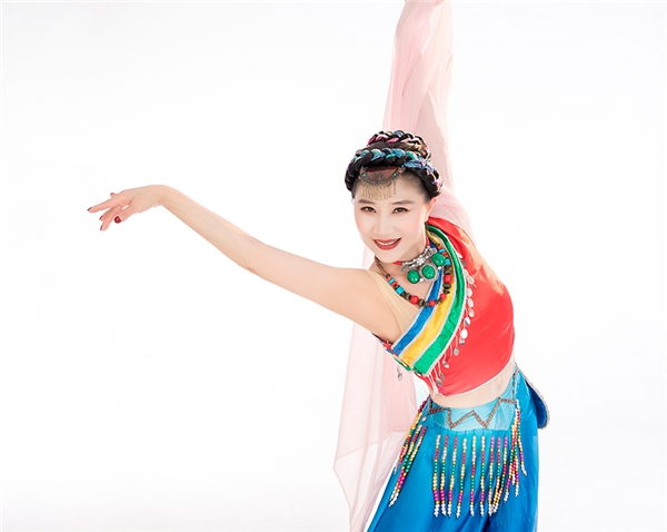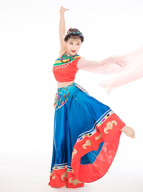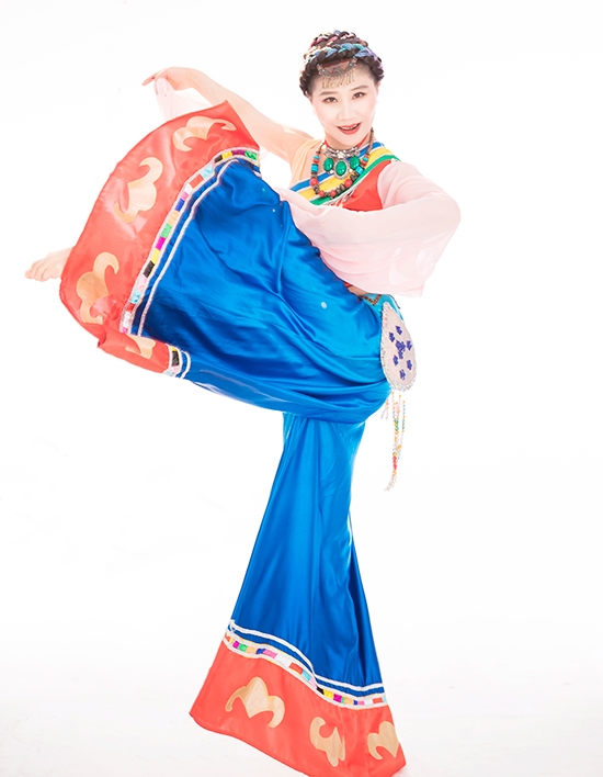 夏冰身着中国风服饰,藏装,大襟、长袖、无扣,华贵祥云印花图案,辫套、项链、腰饰上镶嵌红蓝色珊瑚、绿色松石、黄琥珀、白珍珠等明艳的彩色珠宝,方方面面演绎中华传统文化的特色与魅力。