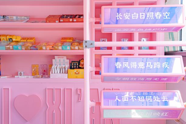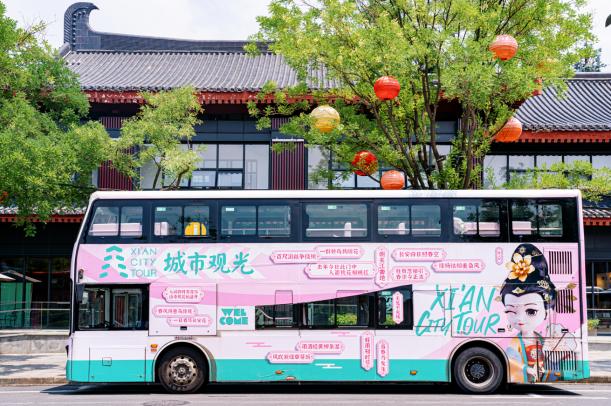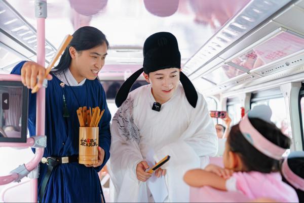 “唐诗主题观光巴士”是全国首辆以“唐诗”为主元素进行装饰的观光车。车身以粉色、金色和蓝色为底色,融合唐诗元素进行装点,以可爱的“唐小妃”、帅气的“城小将”作为外观图案。车内部,随处可见的唐诗名句,以站牌、书签等各种形式呈现,让人感觉如同真的置身唐代,与一众才子名家遣词对句,充满了雅致脱俗的意趣。
