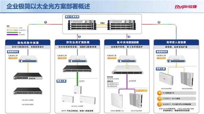 锐捷网络通过深入企业业务场景,深刻理解客户业务诉求,并对以太网协议标准进行深入研究,通过技术突破与革新,创新性使用了“彩光”和“光电混合缆”技术,推出锐捷企业极简以太全光网络解决方案3.X。