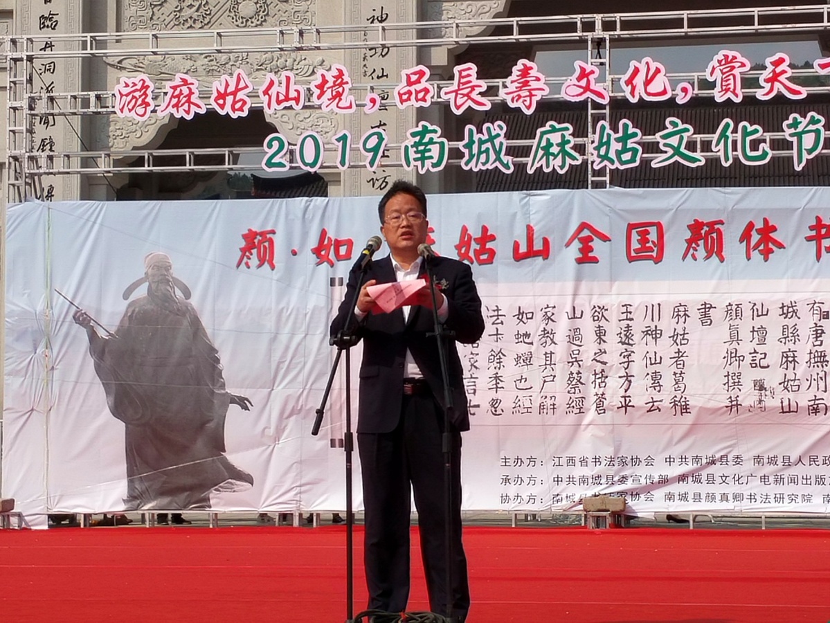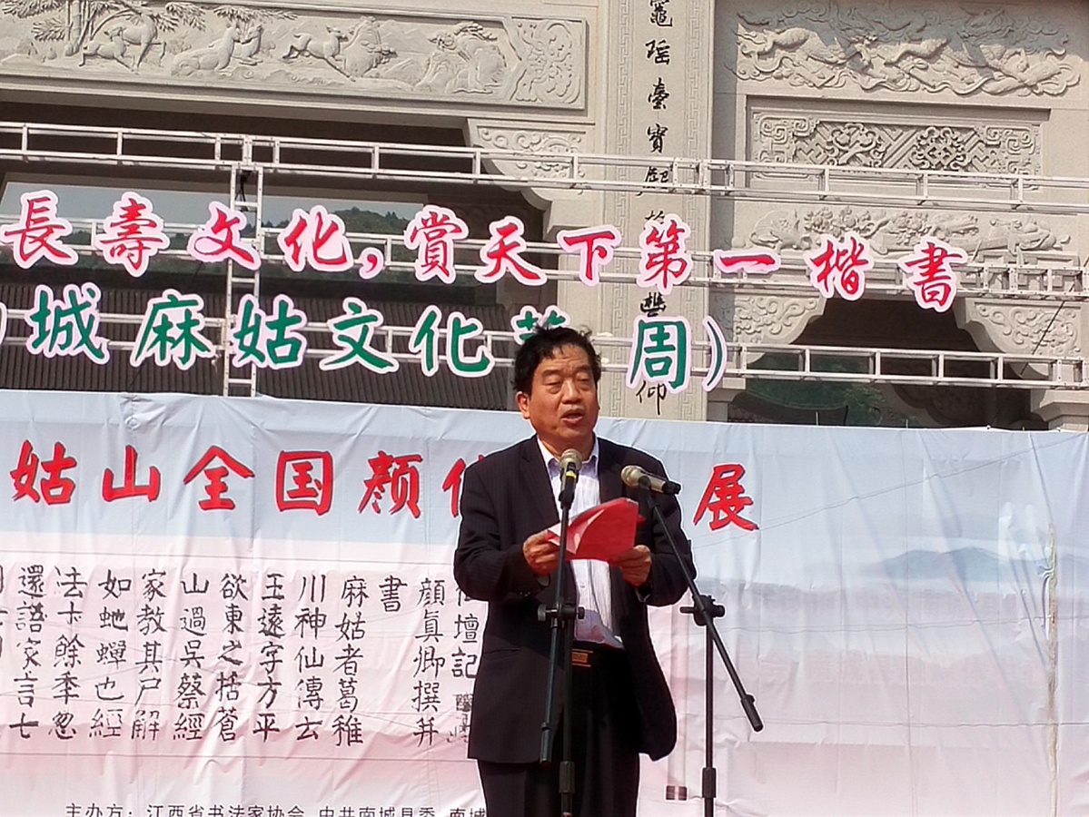 上午九时,活动拉开帷幕。南城县委副书记、县长汪华辉致贺词,向诸位书法家的到来表示热烈的欢迎。他说:“颜体”与南城麻姑山有着深厚渊源,麻姑山是颜真卿“天下第一楷书”留墨地。在麻姑山举办一次上规格的颜体书法展,大力弘扬颜体书法艺术,唱响麻姑文化品牌,一直以来都是南城人民心中的一个夙愿。今天终于得偿所愿,在麻姑山隆重举行麻姑山全国颜体书法展(演)活动,给广大书法爱好者带来一场视觉文化的饕餮盛宴,也势必为打造麻姑山特色文化品牌产生极大的推动作用!