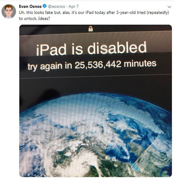 据悉,该男子名为埃文·奥斯诺斯(Evan Osnos),是来自美国纽约的一名撰稿人。由于他年仅3岁的儿子频繁地在他的iPad 上输入错误的解锁密码,目前iPad 屏幕已经出现这样的错误提示:“设备故障,请于25536442分钟后重试”,该时长相当于49年之久。埃文在推特上向网友求助后,有不少网友开玩笑道:“时间会帮你解决这个问题的。”而也有网友帮忙向苹果公司的人员求助,得到的回复是“他们也没办法,直接放弃使用吧”。