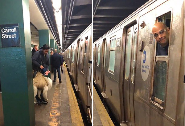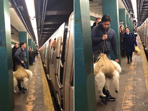 【环球网综合报道】据英国《每日邮报》4月8日报道,近日,在美国纽约布鲁克林一座地铁站内,一名男子用粗麻袋背着一只大型宠物狗企图带进地铁车辆,结果被列车员以麻袋并非“袋子”为理由拒绝搭乘地铁。