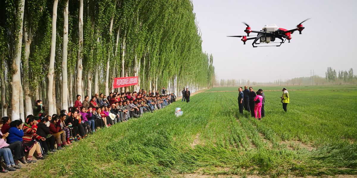 阿克苏地区新和县渭干乡麦农化除打药用上无人直升机。4月11日上午,两架无人机掠过渭干乡阿热吾斯塘村麦田,一边飞行,一边喷洒出细密的农药,随着无人机不断向前飞行,两臂四个喷头开始喷药,一次性可以喷洒四列,农药均匀地撒到叶面上,不漏喷、不重喷。
