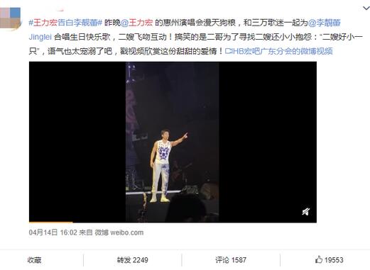 4月14日,王力宏在惠州演唱会上台上老婆李靓蕾,“我的亲爱的perfect老婆也在现场,我爱你,生日快乐”,不仅现场唱起了生日快乐歌,还对着大屏幕上的老婆飞吻。