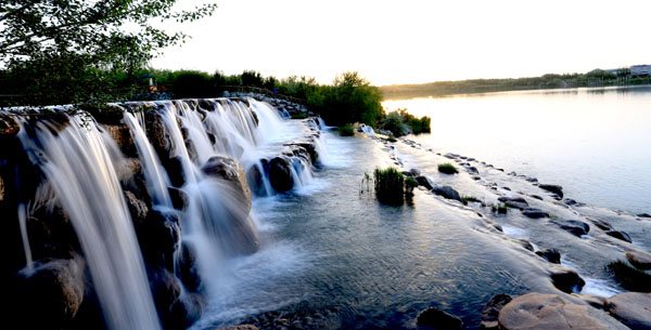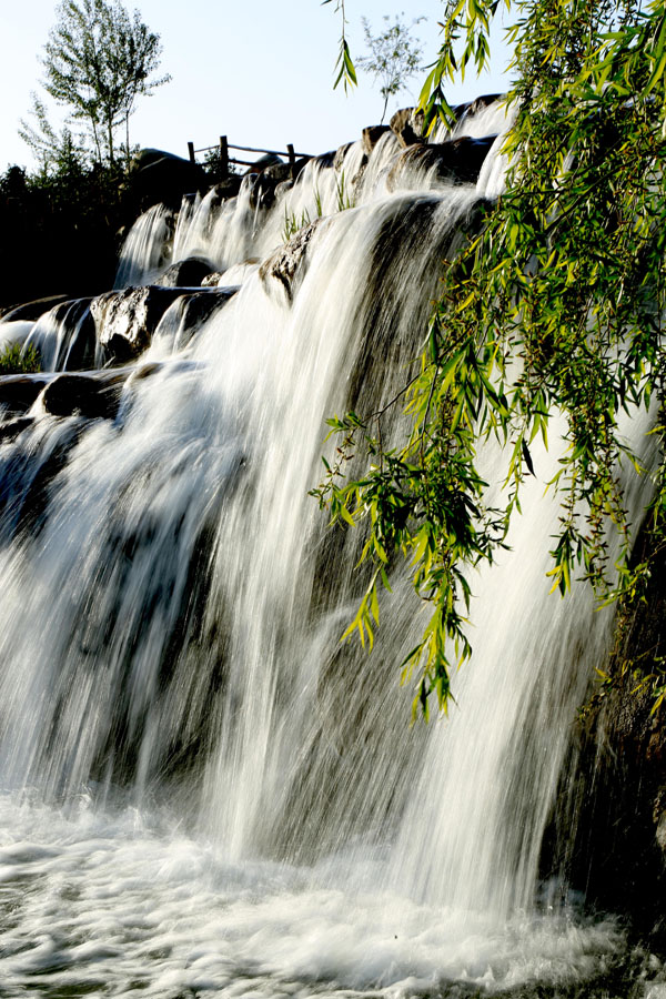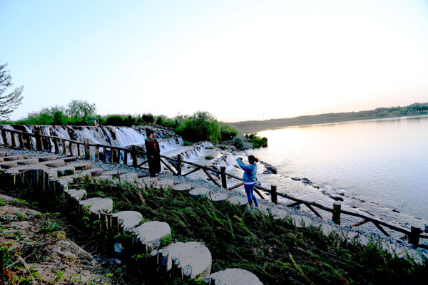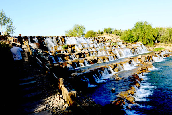 5月13日拍摄的甘肃张掖滨河新区芦水湾景区飞流直下的瀑布。由于连续几日的降雨,甘肃张掖滨河新区芦水湾景区来水量大增,景区内的瀑布带飞流直下十分壮观,市民及游客纷纷前来观看拍照。(摄影陈礼)