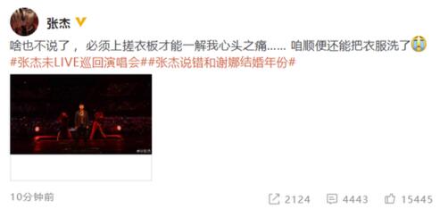 6月2日,张杰就昨日在演唱会说错和谢娜结婚年份一事做出回应。张杰表示:“啥也不说了,必须上搓衣板才能一解我心头之痛……咱顺便还能把衣服洗了。”还配上了自己演唱会的图片,照片中张杰一脸哀伤,但同时又饱含坚定。原来,张杰在昨天演唱会上和小沈阳的对话中,无意间将自己与谢娜的结婚年份2011年说成了2010年,随后网友便纷纷调侃要张杰回家要被谢娜罚跪搓衣板。