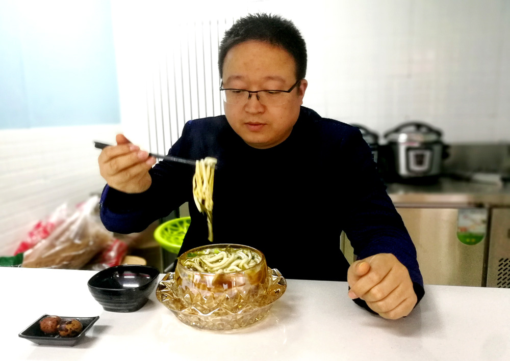 户太刚在试吃公司新推出的土豆粉。摄影:黄玉良