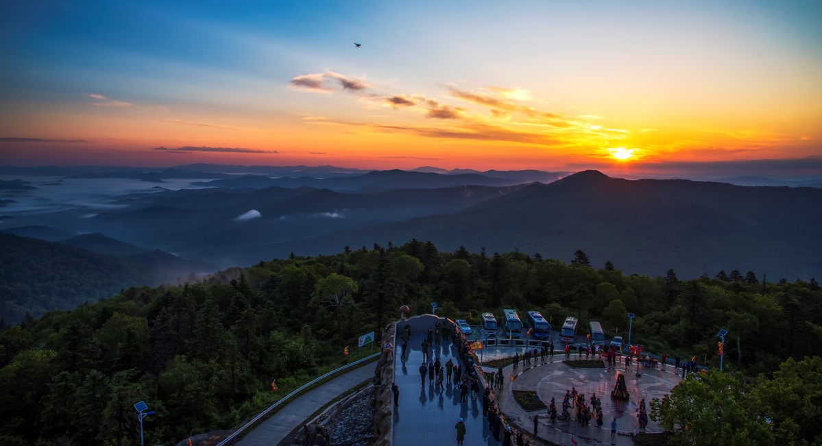 日出、云海、松涛是神顶峰景观“三绝”,其中的日出场景是最令人期待与震撼的。每年的夏至是太阳升起最早的一天,凌晨3点,太阳初露,天边片片云霞如雾似纱;3点30分,一轮红日完整跃出天际线,放眼远方霞光万丈,神顶峰下云海千里。游客们纷纷用手机、相机拍摄下这难忘的盛景。人群中,萨满舞者祭祀祈福,祝愿八方风调雨顺,国泰民安。
