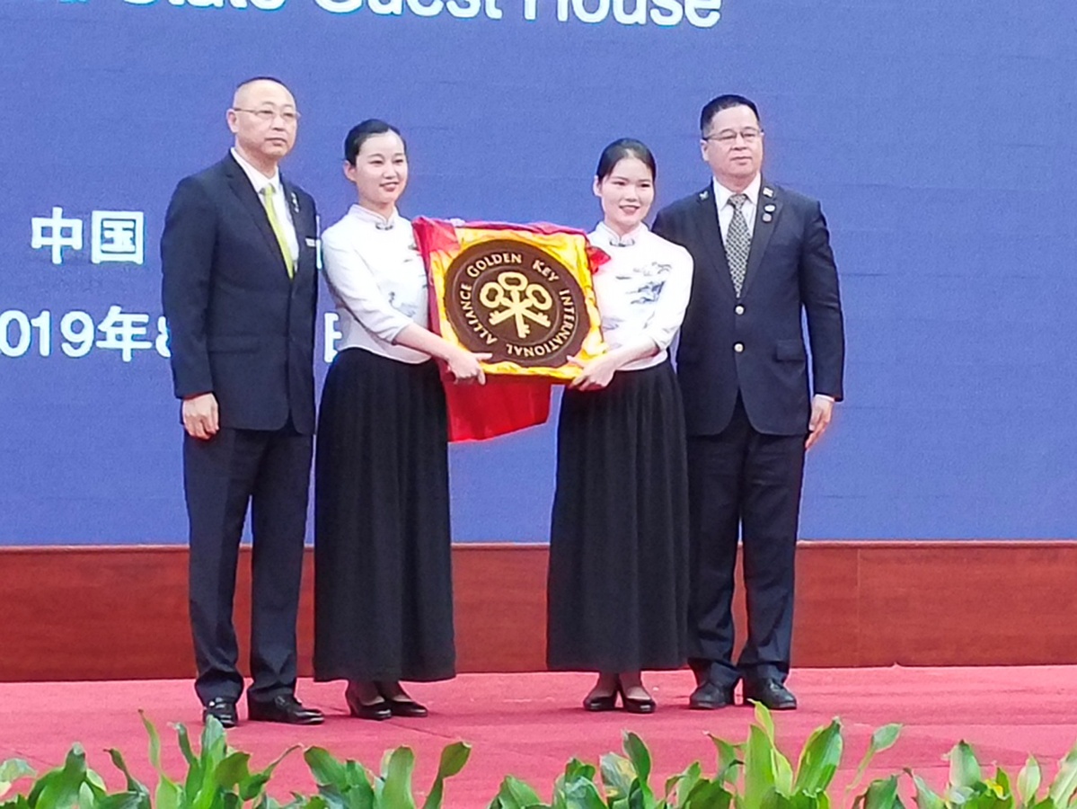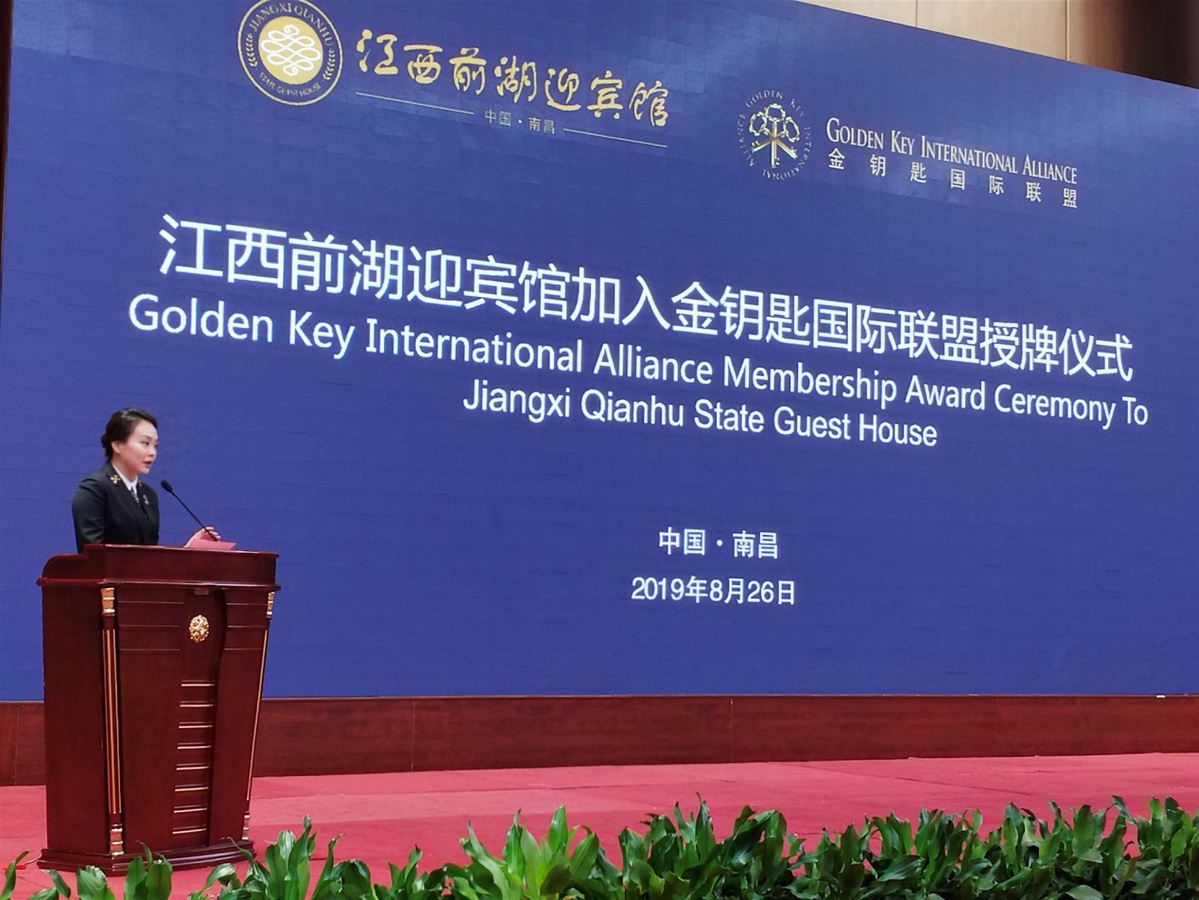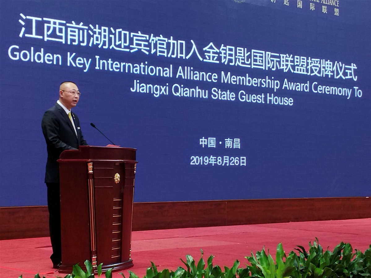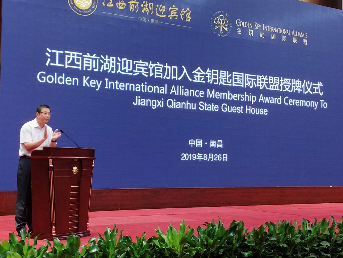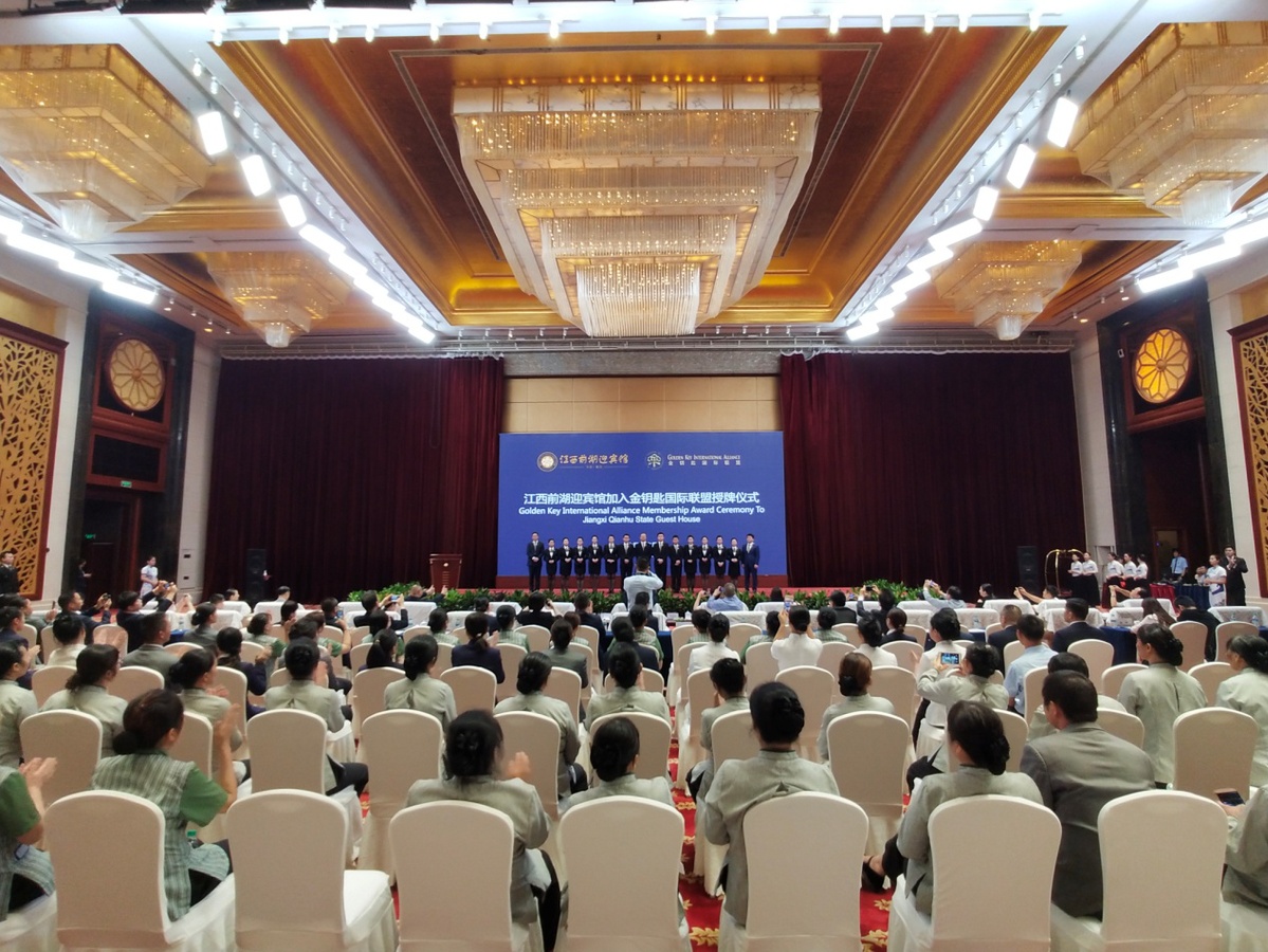 8月26日,江西前湖迎宾馆正式加入“国际金钥匙联盟”,颁证、授牌仪式在赣江厅隆重举行。江西省文化和旅游厅副巡视员章国宝、金钥匙国际联盟首席运营官韩华、江西省餐饮烹饪协会副会长涂立波、江西省旅游协会饭店分会秘书长朱文辉、南昌市烹饪协会副会长章志强及省内众多酒店总经理等嘉宾应邀出席本次盛会。