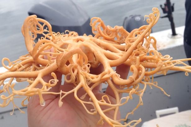 据萨拉·瓦赛尔-阿尔福德(Sarah Vasser-Alford)发布的视频显示,这只长相怪异的海洋生物有着橙色的皮肤,长长的卷曲触角有节奏地伸展着。将其翻转过来后,背面遍布着一条条模糊的“血管”,看上去让人惊恐不已,堪比恐怖片。