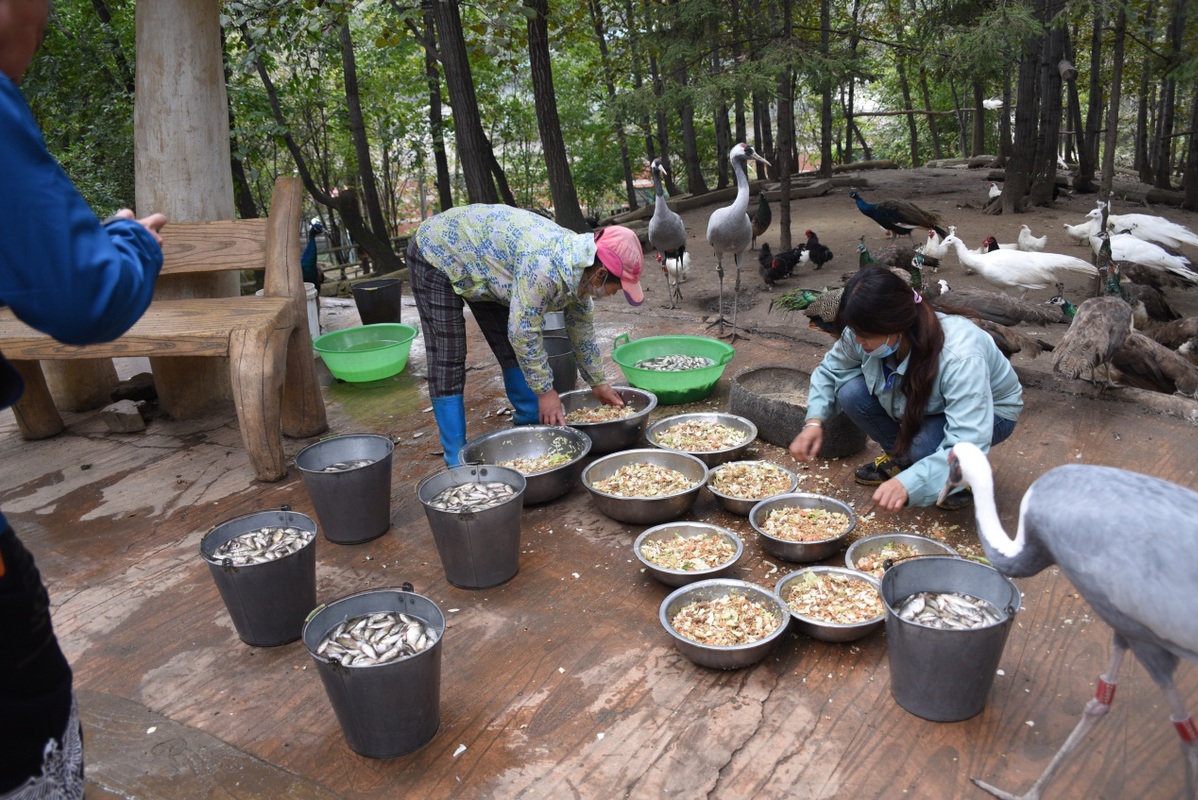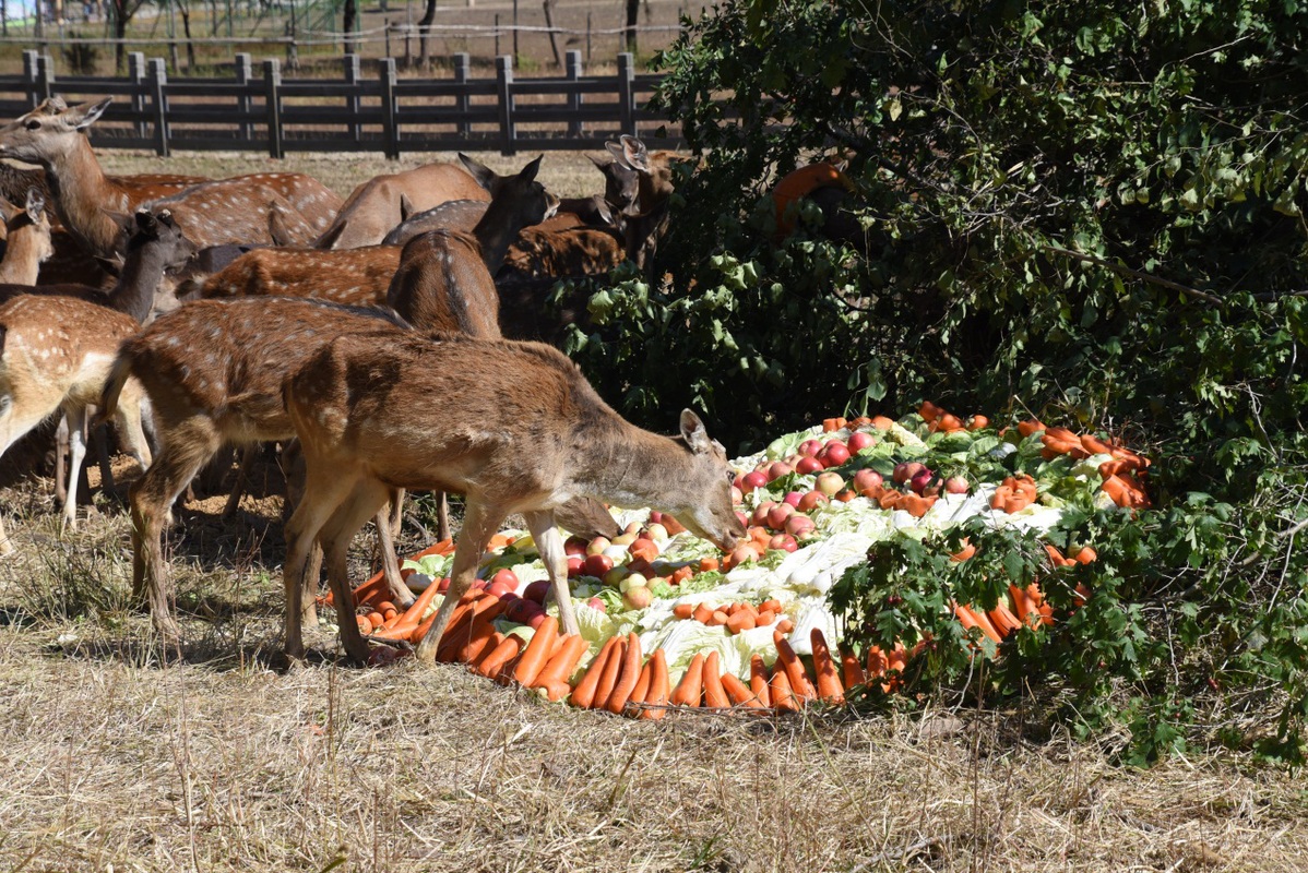 在北方一到秋天,象、梅花鹿、角马等草食动物就没有青草吃了,不过不要紧,动物园为它们提供无限量供应的干苜蓿、干羊草、柞树叶,还有新鲜的蔬菜、水果,增加维生素。此外,还为它们量身定制的不同种类的更高蛋白、更高能量、更营养、更科学的颗粒状混合饲料,让它们抓好秋膘储存更多脂肪。