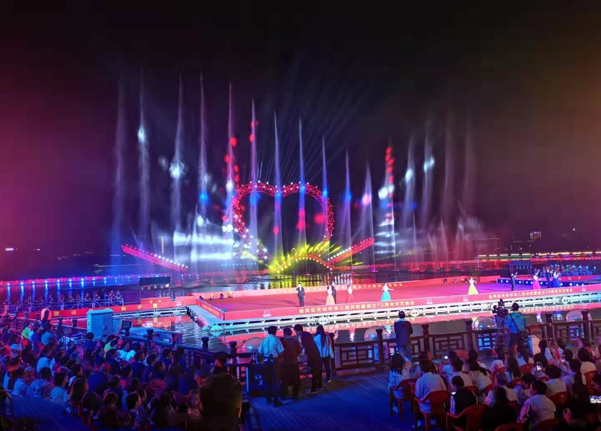 “我和我的祖国一刻也不能分割,无论我走到哪里都流出一首赞歌……” 9月28日晚上8点,阅海湾中央商务区水上公园灯光璀璨,气氛热烈,金凤区“庆祝中华人民共和国成立70周年晚会”在快闪《我和我的祖国》营造出的喜庆氛围中拉开帷幕。