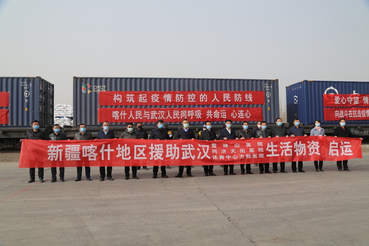 2月18日19时02分,伴随着火车汽笛长鸣,搭载着6组装有核桃、牛奶、红枣、方便面等援助生活物资集装箱的11032次货物列车准时从喀什火车站缓缓驶出,跨越4500多公里,向武汉吴家山站方向驶去,将南疆各族人民的深情厚谊送到雷神山医院、体育中心方舱医院及同济天佑医院。