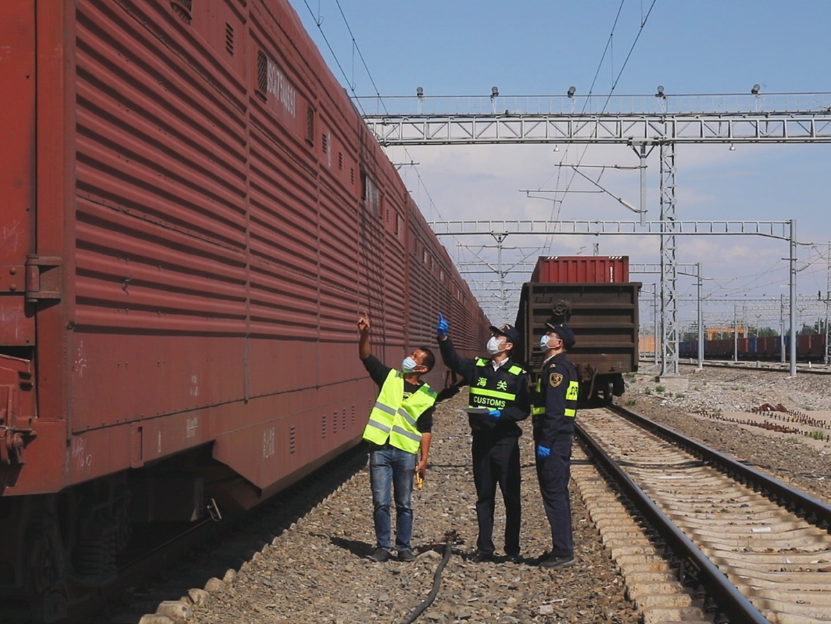 霍尔果斯海关关员对班列进行监管 龙腾(摄) |