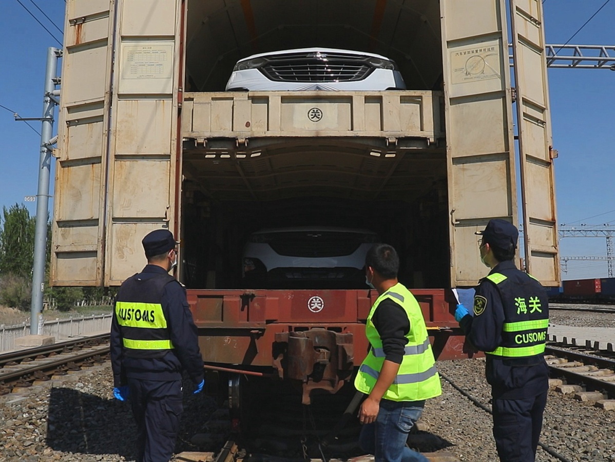 4月23日,载有252辆上汽通用雪佛兰汽车的中欧班列在霍尔果斯海关监管下,经霍尔果斯铁路口岸顺利出境。