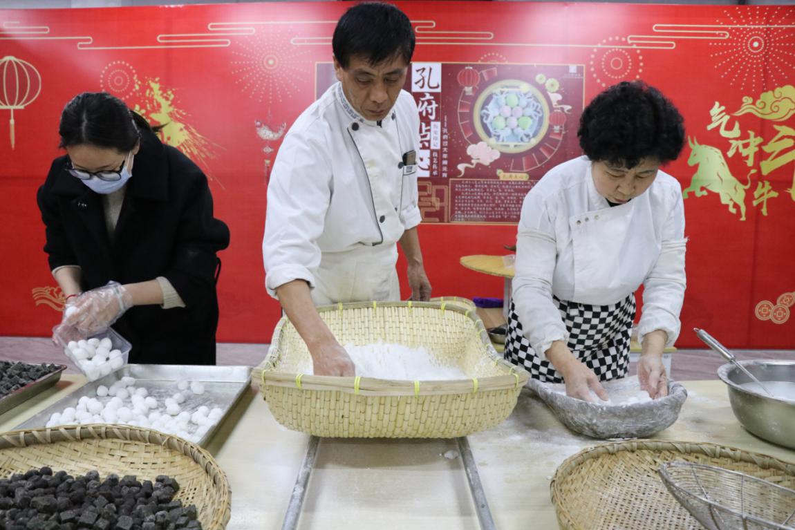 在元宵制作区,孔府糕点师傅周传梅和她的徒弟教授大家如何把元宵做得好吃又好看。
