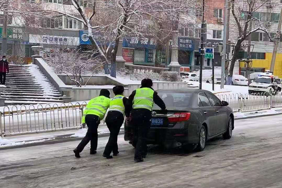 21日早,因路面结冰、车流增加,许多坡路因行驶缓慢、导致起步慢,加剧通行难,广大交警长时间坚守路面,强化现场引导和沿线路口的指挥疏解,直至市区道路通行全部恢复正常。期间,南岗区红军街与民益街交口处坡路、道里区霁虹桥等路段受影响较大,许多车辆因无法顺利冲坡出现了车轮打滑、停滞不前的情况,岗上交警一面组织车辆梯次冲坡,一面帮助遇困车辆推行,保证了沿线通行的安全、有序,执勤交警克服天冷风硬、不避车轮下冰雪飞溅、无畏路滑摔倒危险,一台接一台用力推行的积极履职担当受到了过往驾驶人的一致称赞。同时,交警部门积极联系环卫部门对各重点坡路路面结冰进行有效清理,并组织警力保障环卫部门开展人工安全作业和大型机械化清雪作业,使得路面状况得到改善,道路通行状况逐步恢复正常。