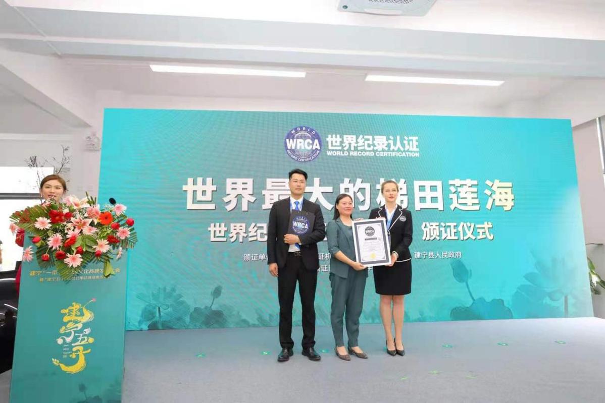 7月22日,在建宁县“一带一路”莲文化大会暨“建宁五子”区域公用品牌成果发布会上传来好消息:位于中国福建省三明市建宁县的坪上梯田莲海,面积为733333平方米(1100亩),经世界纪录认证(WRCA)官方审核,被确认为“世界最大的梯田莲海”。