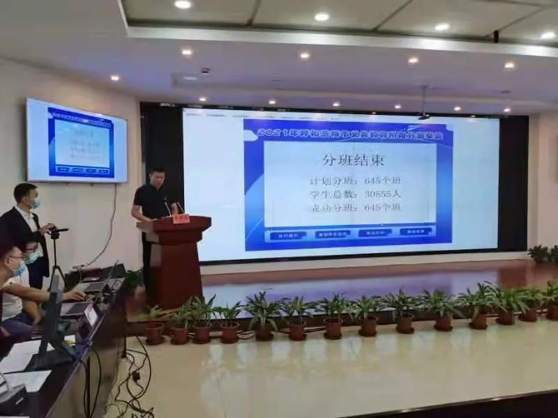 8月25日10时,2021年呼和浩特市市四区义务教育阶段学校“阳光分班”现场会在市教育招生考试中心六楼会议室召开。当日参加义务教育阶段起始年级“阳光分班”的学生共52499人,共分班1103个,参加“阳光分班”的班主任共1103人。