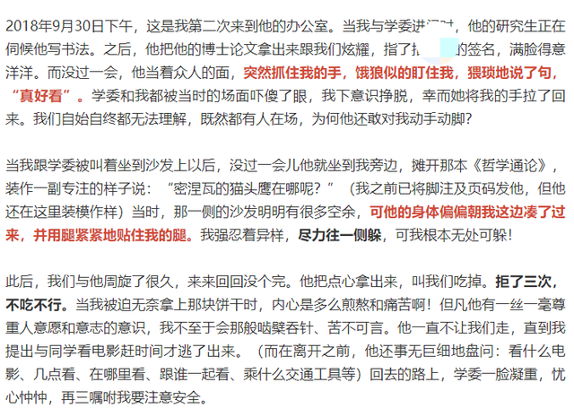 文章回忆,2018年9月30日、2020年6月14日,当事人分别第二次、第三次因故来到乌某办公室,但遭遇对方动手骚扰或言语羞辱,“当我问他为何对我动手动脚,给我造成了莫大的阴影和创伤时,乌教授对于之前的恶行全无悔意,相反,竟然开始指责我想太多。”