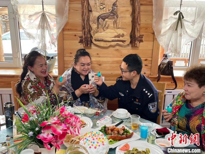 图为边境管理警察与当地俄罗斯民众撞彩蛋。 包智明 摄