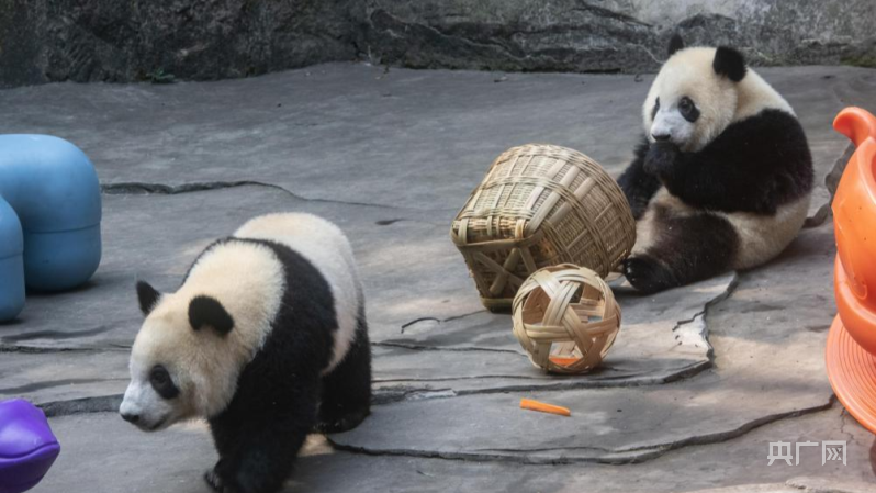 在当天的庆祝会上,“熊晓开”和“猫晓域”的家被装扮得充满童趣,小黄鸭、摇摇椅、竹编球等玩具摆了一地,两只小家伙玩得不亦乐乎。