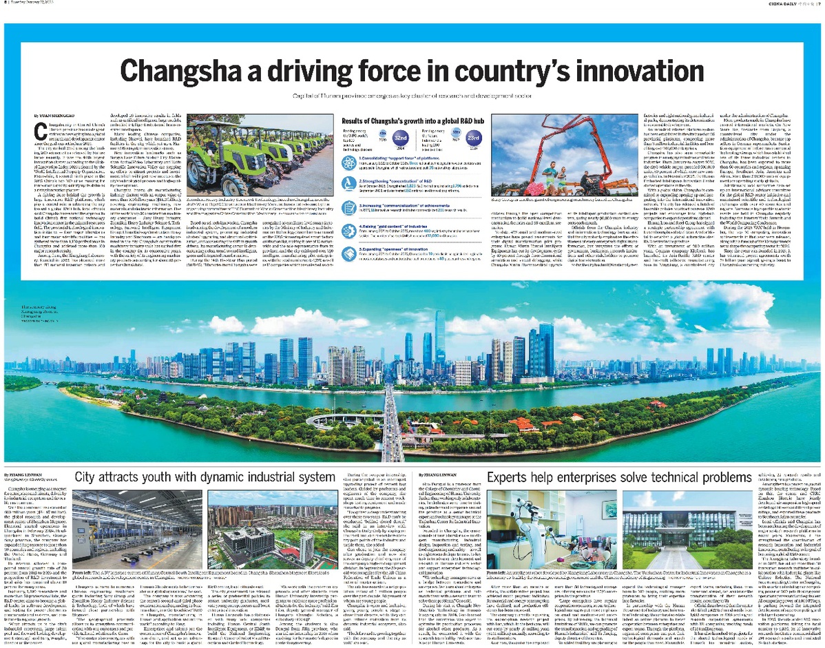 编者按:1月27日,中国日报推出跨版专题【岳麓山下 科创潮涌:长沙加快向全球研发中心城市迈进】,讲述长沙锚定全球研发中心城市建设目标,发挥重大科研平台牵引作用,以科技创新赋能现代化产业体系,链接全球创新资源,凭借优良生态打造企业与人才的“强磁场”,让人才活力与城市创新实现深度耦合。