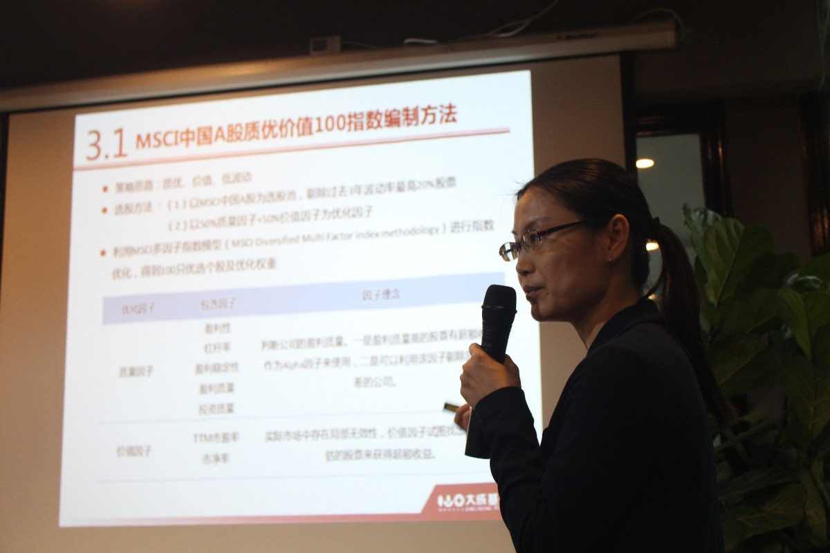 最后,大成基金数量与指数投资部基金经理张钟玉介绍了大成基金与MSCI合作研发的中国质优价值100指数和共同发布的业内第一只MSCI公募定制指数——大成MSCI中国A股质优价值100指数ETF(代码:515520)。 MSCI中国质优价值100指数遵循价值投资的理念,秉承“美国漂亮50”精髓,以质优、价值、低波动为策略,优选个股、优化权重,拥有高分红、高夏普比率和高性价比的特征。因为历史业绩优秀,超额收益明显;MSCI中国A股质优价值100指数也被业内称为“中国的漂亮100指数”。继大成MSCI中国A股质优价值100指数ETF 8月19日开始发行之后,大成MSCI中国A股质优价值100指数ETF联接基金也于9月2日发售。