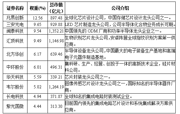 在与当前市场上的同类指数对比后发现,国证芯片指数平均个股市值更大、营收增速更高、盈利能力更强,因此更具备龙头属性,更能代表半导体芯片行业走势。而从成份股来看,国证芯片指数前十大成份股合计权重占比73.4%,且均属于半导体芯片行业的龙头企业,具有较强的代表性。