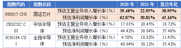 成份股高预期净利润增长推高了整个指数的盈利预期,根据Wind数据,未来两年国证芯片指数预估主营业务收入增长率和净利润增长率每年都好于同类的中华半导体指数和全指半导体指数的表现。